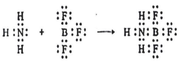 उदाहरण- (i) NH3 और BF3के बीच अभिक्रिया होने पर बोरन ट्राइफ्लोराइड अमोनिया बनता है। NH3 और BF3 की इलेक्ट्रॉनिक Creation देखने पर पता चलता है कि NH3 के Nपरमाणु के पास इलेक्ट्रॉनों की Single निर्जन जोड़ी है, किन्तु BF3 के B परमाणु की बाहा्र कक्षा में केवल छ: इलेक्ट्रॉन हैं।