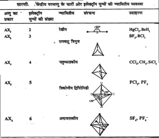 - अणु या आयन मे केन्द्रीय परमाणु के चारो ओर इलेक्ट्रॉन युग्मों की व्यवस्था संयोजकता कोश में उपस्थित बंधी और अबंधी इलेक्ट्रॉन युग्मों की कुल संख्या पर निर्भर करती है।