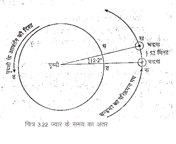 सामान्यत: ज्वार-भाटा दिन में दो बर आता है, किन्तु Single ज्वार के बाद दूसरा ज्वार 12 घण्टे बाद न आकर 12 घण्टे 26 मिनट बाद और तीसरा ज्वार 24 घण्टे 52 मिनट बाद आता है। इसका कारण यह है कि Earth की परिभ्रमण गाति के साथ-साथ चन्द्रमा भी Earth के चारों ओर परिक्रमा करता है। फलत: Earth का वह स्थान जो चन्द्रमा के सामने है, Earth की दैनिक गति के कारण चक्कर लगाकर जब तक पुन: उसी स्थान पर 24 घण्टे में आयेगा, तब तक चन्द्रमा Earth की परिक्रमा में आगे निकल जाता हैं। अत: उस स्थान को पुन: चन्द्रमा के सामने पहॅुचने में 52 मिनट का अतिरिक्त समय लगता है। इसीलिये ज्वार के आने के समय में अन्तर आता है।